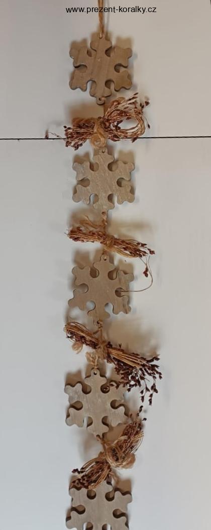Vánoční girlanda s motivem vloček je vyrobena ze dřeva a je laděna do hnědých a šedých barev. Délka girlandy je 56,5 cm, průměr jedné vločky je 6,8 cm. Tato girlanda je vhodnou zimní dekorací.