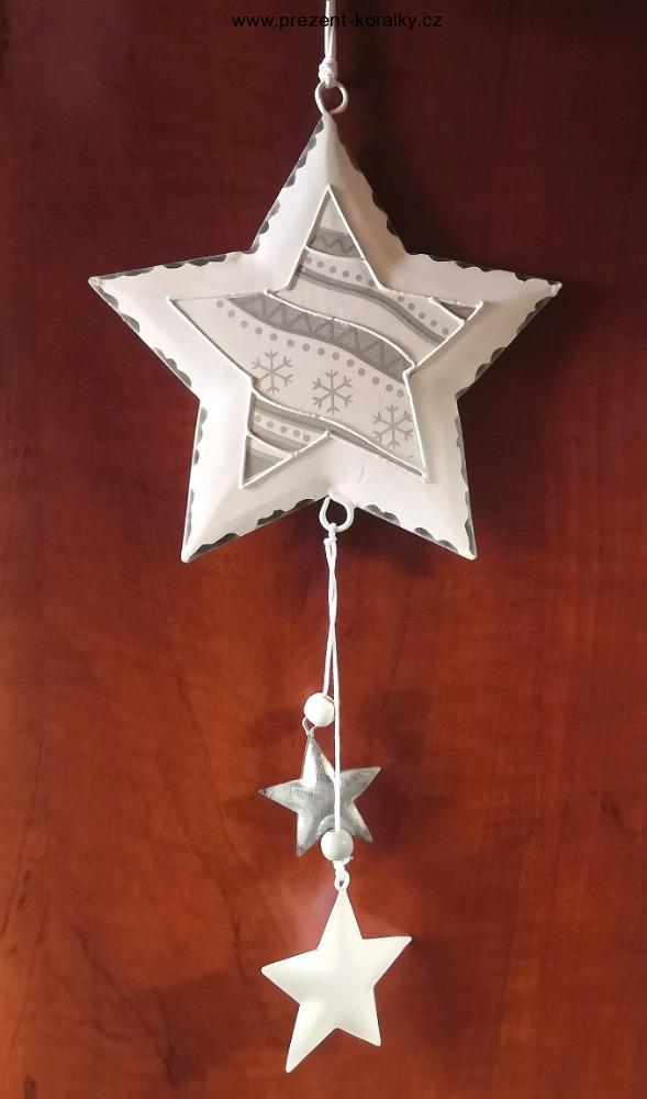 Plechová girlanda se skládá ze tří hvězdíček největší je o velikosti 15 cm. Prostřední hvězdička je stříbrné barvy a její velikost je 4 cm. Třetí hvězdička je bílé barvy a její veliost je 6 cm. Celková délka girlandy je 42 cm a zaručeně krásně ozdobí každý byt či dům.