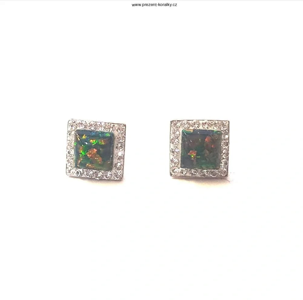 Stříbrné rhodiované náušnice Ag 925 s modrým opálem mají zapínání řešené na puzetku. Rozměr náušnic je 0,8 cm x 0,8 cm a zdobí je SW kamínky čiré barvy.