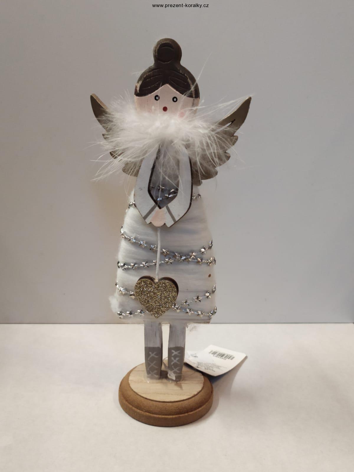 Andílka vyrobeného ze dřeva a látky zdobí okolo krku krásná bílá labutěnka. Dřevěný andílek je vysoký 22 cm, šířku v křídlech má 9 cm. Tento andílek s labutěnkou stojí na dřevěném podstavci o průměru 6 cm. Tento krásný andílek se hodí jako dárek nebo jako dekorace do každé domácnosti.