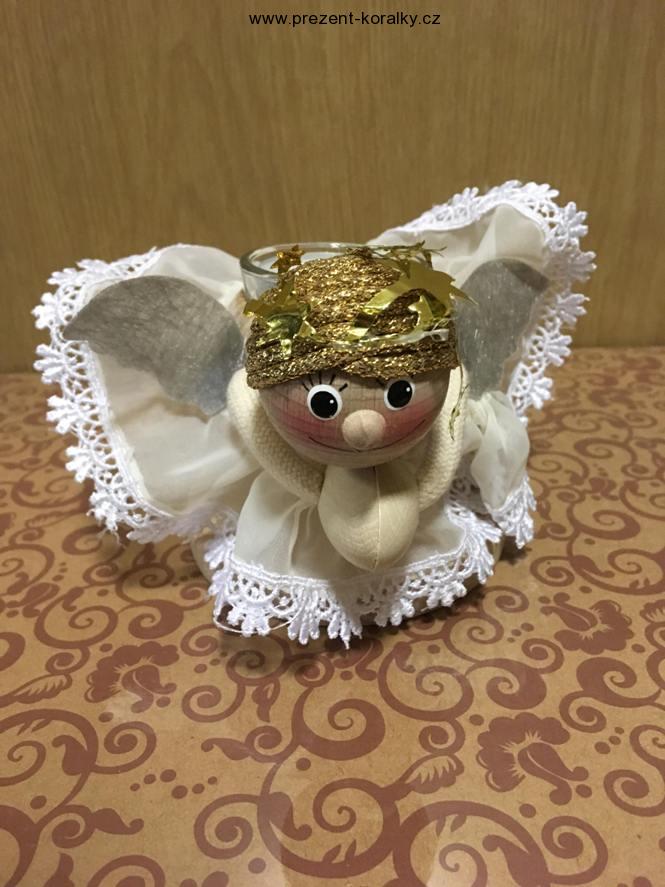Veselý dřevěný andílek má krajkové šatičky a zlatou čepičku. Andílek má na zádech skleničku do které se vloží čajová svíčka. Andílek leží na dřevěném kulatém podstavci o půměru 9,3 cm a je vysoký včetně podstavce 8,5 cm. Tato dekorace je vhodná do každého interiéru.