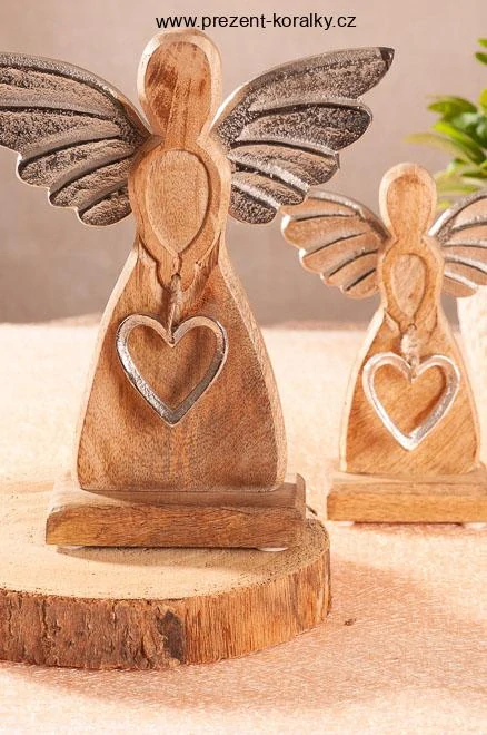 Soška anděla je vyrobena z mangového dřeva, jeho křídla jsou z kovu. Anděl má v ruce kovové srdce. Anděl je vysoký 21 cm a šířku v křídlech má 19 cm. Tento moderní anděl je vhodným dárkem pro Vaše blízké či vhodnou dekorací do každé domácnosti.