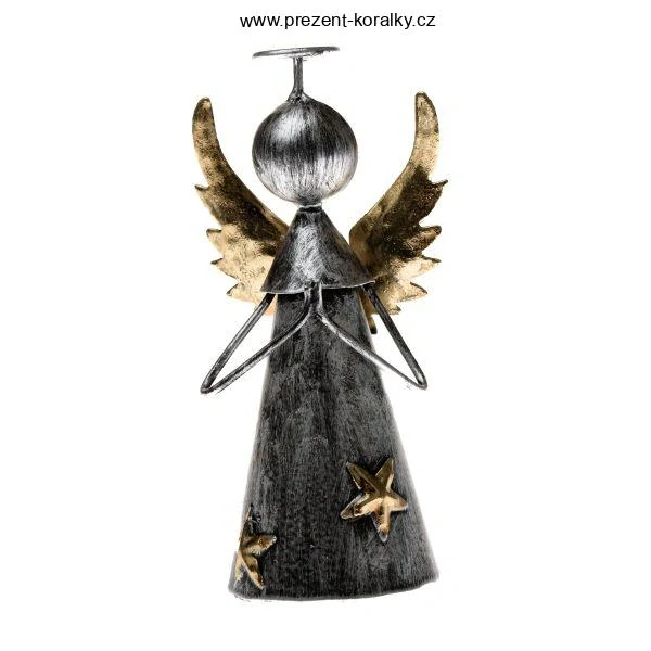 Soška andílka je vyrobena z plechu. Anděl je laděn do stříbrné a zlaté barvy. Andílek je vysoký 13,5 cm, šířku v křídlech má 6,3 cm. Tato soška krásného andílka se hodí jako moderní dekorace do každého bytu či domu.