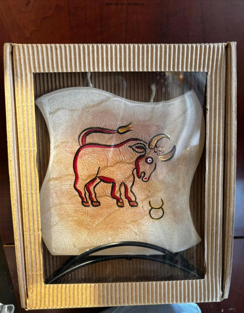 Parafínová plochá svíčka s motivem znamení zvěrokruhu. Svíčka se znamením býk, součástí balení je i kovový stojánek, dodáváme v originální dárkové krabičce. Výška 13,5cm, šířka 12cm. Tato svíčka je vhodným dárkem české výroby.