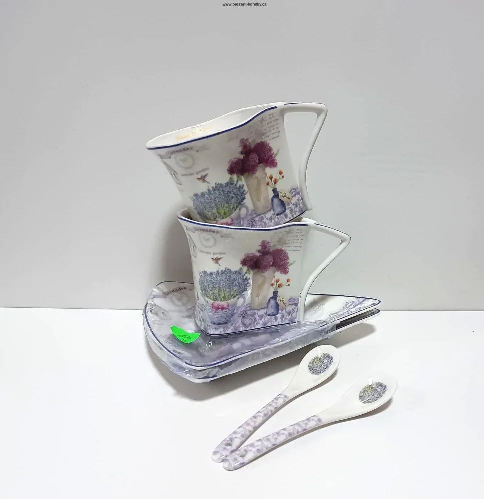 Sada hrnků s podšálky s motivem levandule se skládá ze 2 hrnků, 2 podšálků a 2 lžiček. Hrnky mají atypický tvar a rozměr jejich spodku je 8 cm x 7,5 cm x 5,7 cm, jejich výška je 8 cm. Rozměr podšálku je 17 cm x 13,2 cm x 18 cm. Sada je dodávaná v dárkové krabičce s motivem květů. Tento levandulový porcelán je vhodný pro myčky a mikrovlnné trouby