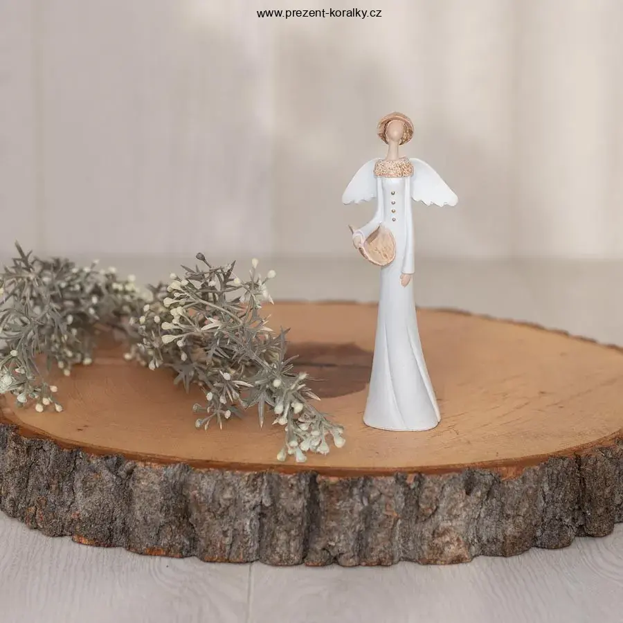 Soška anděla bílé a béžové barvy je vyrobena z polyuretanu. Andělka je oblečená do zimního kabátku. Soška hrajícího anděla je vysoká 24,5 cm, průměr spodku sošky je 6 cm. Andělka s košíkem se hodí jako moderní dekorace do každé domácnost, potěší i jako originální dárek.