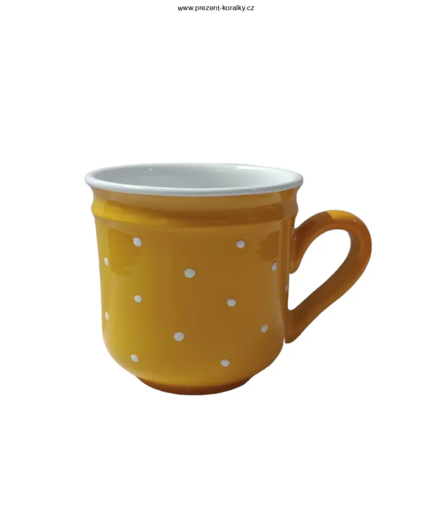Keramický žlutý hrnek s puntíky je České výroby. Český hrnek je ručně malovaný, bílé puntíky taktéž. Puntíkovaný hrníček má objem 500 ml a jeho výška je 10 cm a průměr je 10 cm. Hrnek vhodný na teplé i studené nápoje, můžete ho používat v mikrovlnné troubě, myčce i ohřávat na kamnech.