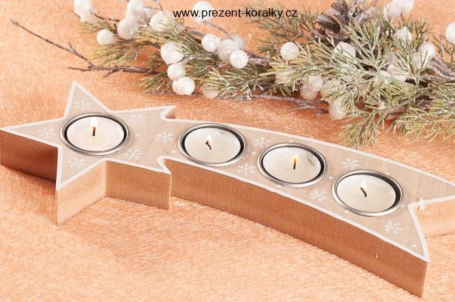 Dřevěný adventní svícen na čtyři svíčky je vyrobený ze dřeva. Tento adventní svícen má tvar komety a je dlouhý 32 cm. Svíčky, které do svícnu pasují, mohou být čajové. Svícen je vhodný jako dekorace na vánoční stůl nebo v období adventu.