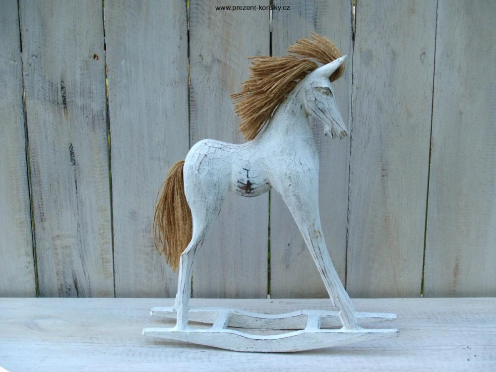 Tato soška houpacího koníka je vyrobena ze dřeva a je laděna do bílé barvy. Rozměr houpacího koníka je 46 cm x 30 cm x 13,5 cm. Tato dekorace houpacího koníka je vhodnou dekorací do každé domácnosti.