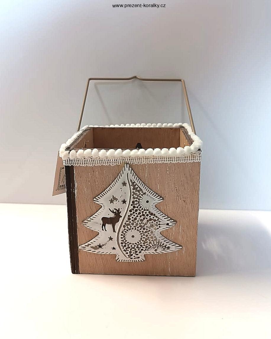 Lucerna je vyrobená ze dřeva a je zdobená motivem stromu s malými otvory, nimiž prosvicuje světlo svíčky. Rozměr lucerny je 9 cm x 8,5 cm x 8,5 cm. Tato lucerna zaručeně naladí Vánoční pohodu v každé domácnosti.