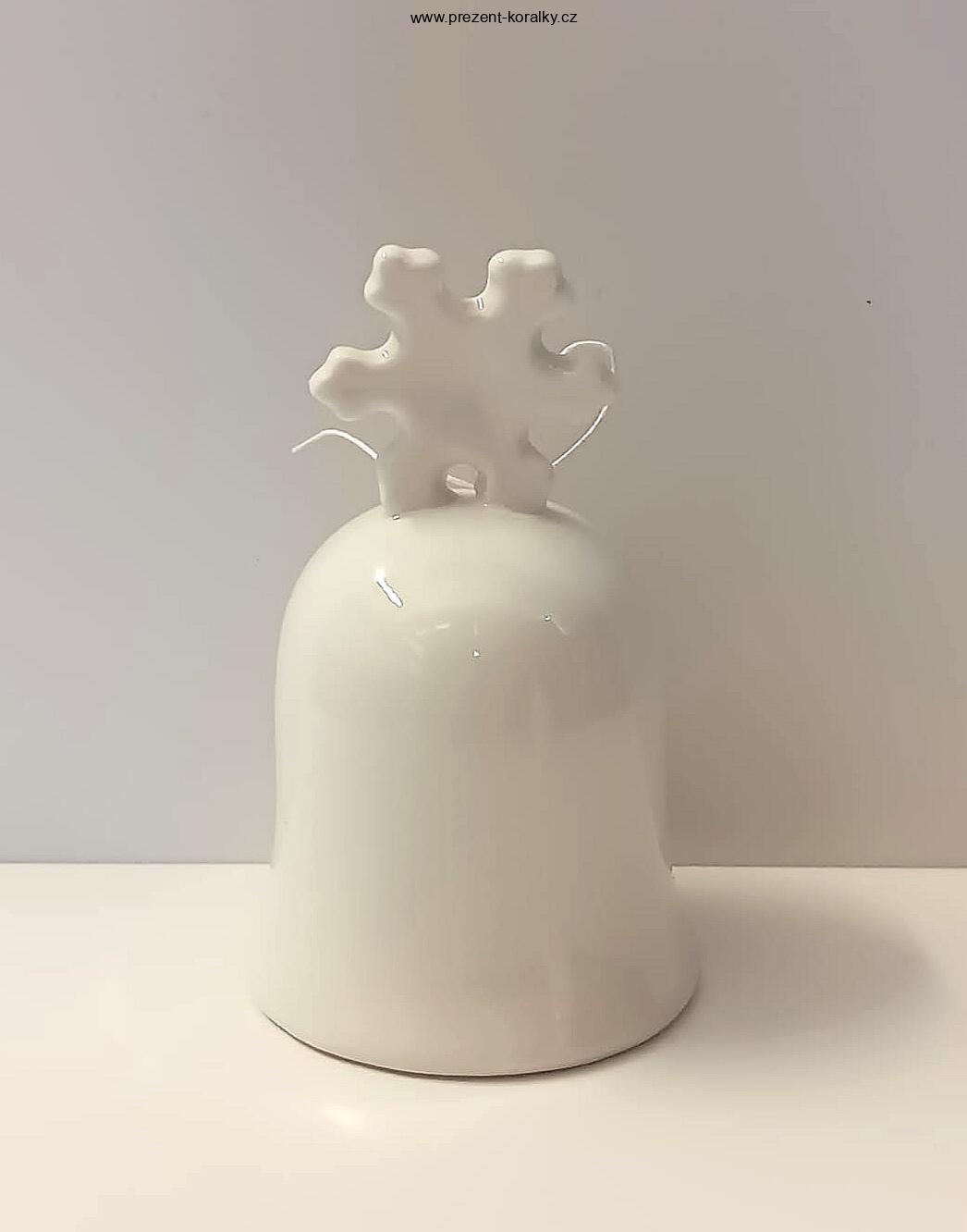 Keramický zvoneček je laděný do bílé barvy a je ozvláštněn rukojetí ve tvaru vločky. Zvoneček je vysoký 10 cm, jeho průměr je 6,5 cm. Tento zimní zvoneček je vhodný jako vánoční dekorace či jako originální dárek.