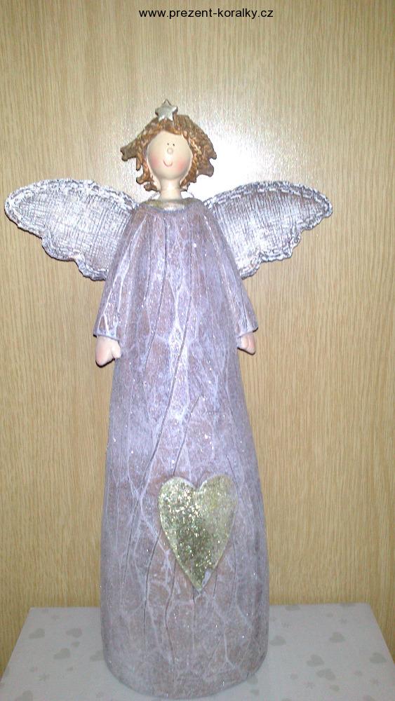Větší třpytivý anděl se zlatým srdcem na šatech je vyroben z polyuretanu. Rozměry : výška 20 cm, šířka 9 cm.