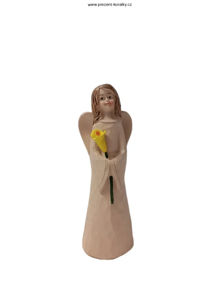 Soška andílka je vyrobena z polyuretanu a je laděna do béžové barvy. Andělka drží žlutou květinu. Andílek je vysoký 15 cm a široký v křídlech je 5 cm. Tento krásný andílek s květinou se hodí jako moderní dekorace do každého bytu či domu. Vhodný také jako dárek pro každého milovníka andělů.