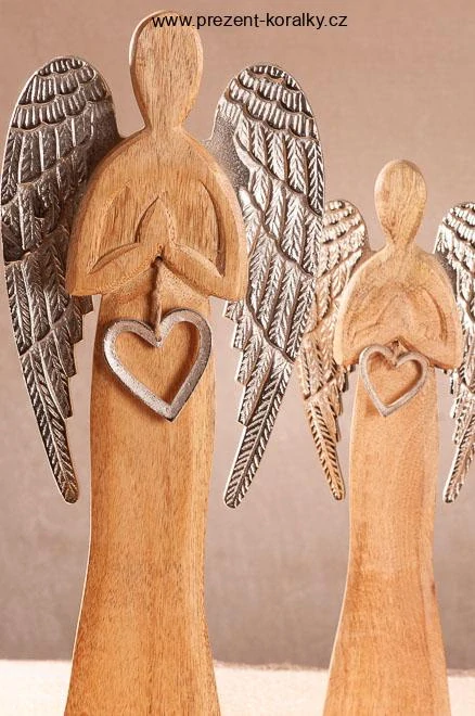 Soška anděla je vyrobena z mangového dřeva, jeho křídla jsou z kovu. Anděl má v ruce kovové srdce. Anděl je vysoký 53 cm a šířku v křídlech má 19 cm. Tento moderní anděl je vhodným dárkem pro Vaše blízké či vhodnou dekorací do každé domácnosti.