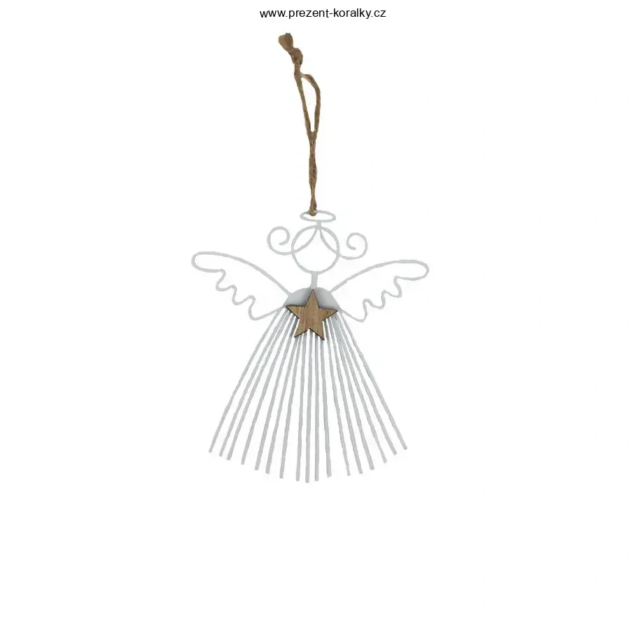 Andílek je vyrobený z plechuu a je určený k zavěšení. Andílka zdobí krásná hvězdička ze dřeva. Rozměry andílka jsou 8,5 cm x 7,8 cm + 6 cm provázek k zavěšení. Anděl je vhodnou dekorací do každé domácnosti.
