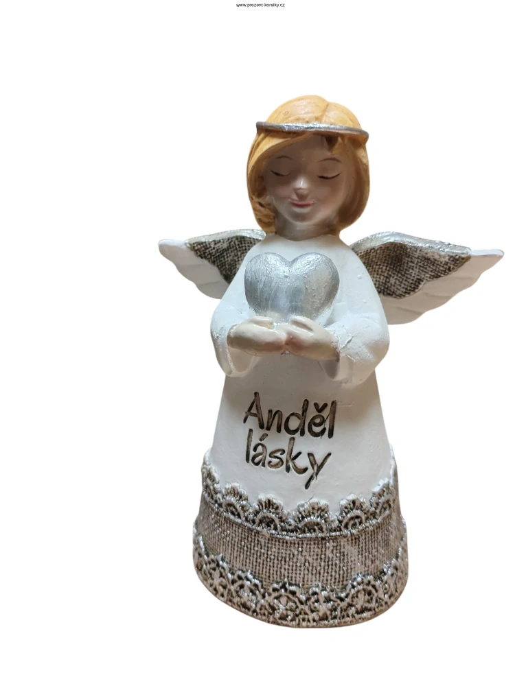 Soška anděla je vyrobena z polyuretanu. Andílek má bílo-stříbrnou barvu a zdobí ho nápis ''Anděl lásky''. Anděl je vysoký 16 cm a jeho šířka v křídlech je 12 cm. Anděl je vhodný jako dáreček, skvěle se hodí jako dekorace do každého bytu či domu.