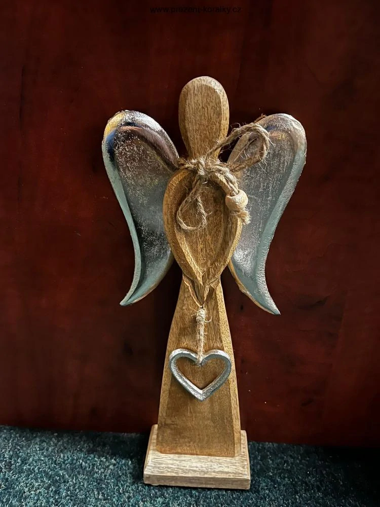 Soška anděla je vyrobena z mangového dřeva, jeho křídla jsou z kovu. Tento dřevěný anděl má v ruce kovové srdce. Anděl je vysoký 31,5 cm a šířku v křídlech má 13 cm. Tento moderní anděl je vhodným dárkem pro Vaše blízké či vhodnou dekorací do každé domácnosti.
