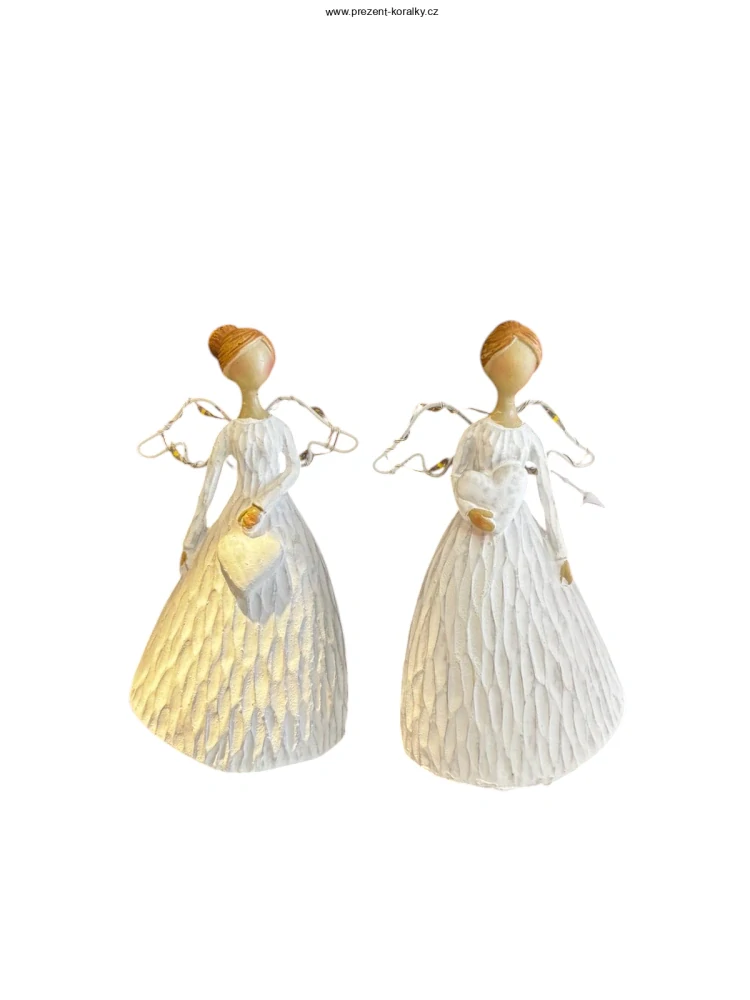 Soška anděla je vyrobená z polyuretanu a je laděna do bílé barvy. Andělka je vysoká 12 cm, šířku v křídlech má 6 cm. Andělku zdobí její zářivá svítící křídla a bílé srdce, které drží. Anděl je vhodným dárkem pro Vaše milované.
