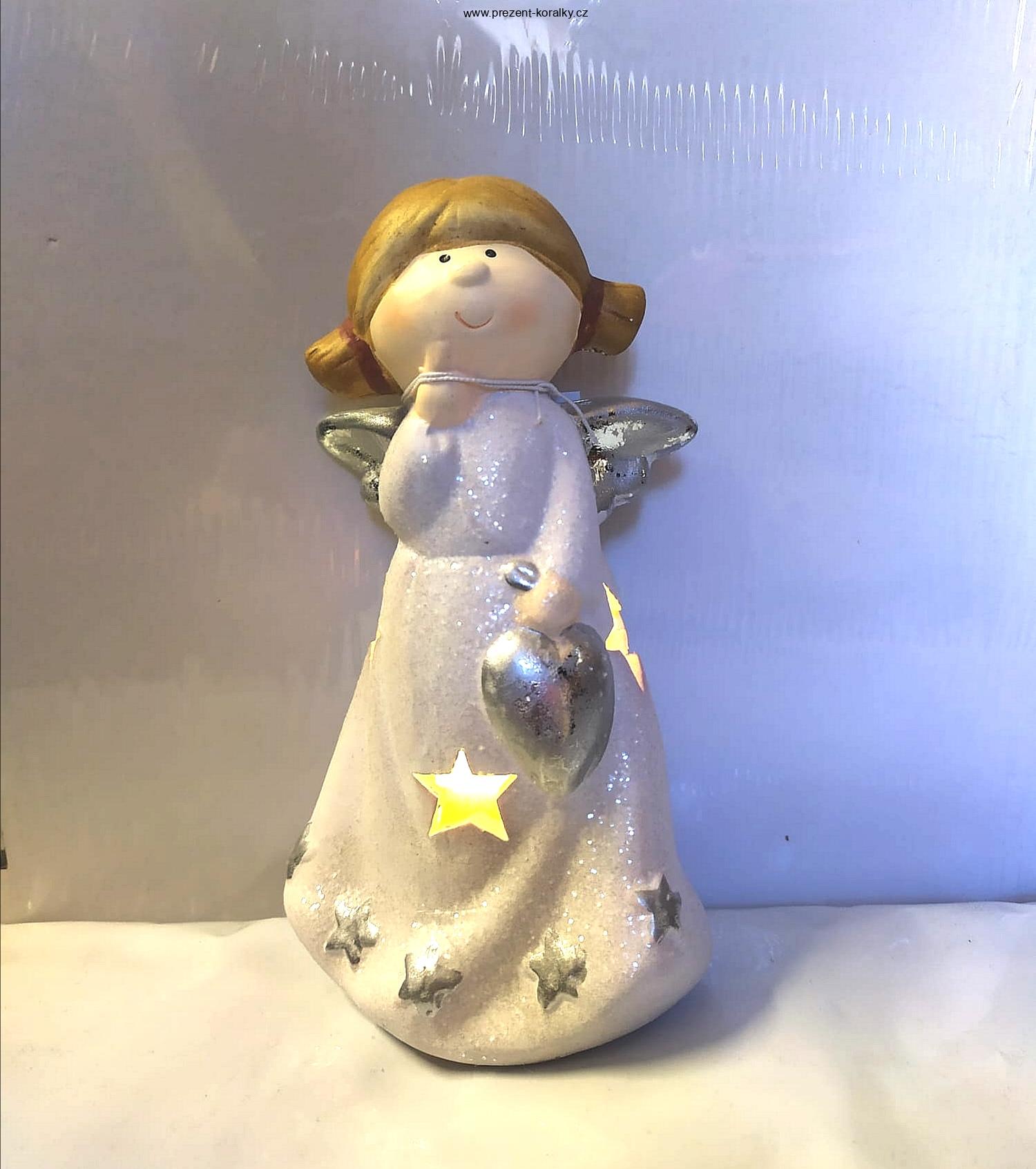 Andílek je vyrobený z polyuratanu a je vysoký 16 cm a široký v křídlech je 8,2 cm. Andílek má blond vlásky a v ruce drží stříbrné srdíčko. Andělka je vhodná jako osobní dáreček pro Vašeho blízkého anděla. Tento andílek je na baterky. Anděl má v sukni otvory ve tvaru hvězd, díky nimž prozařuje světlo baterky uvnitř.