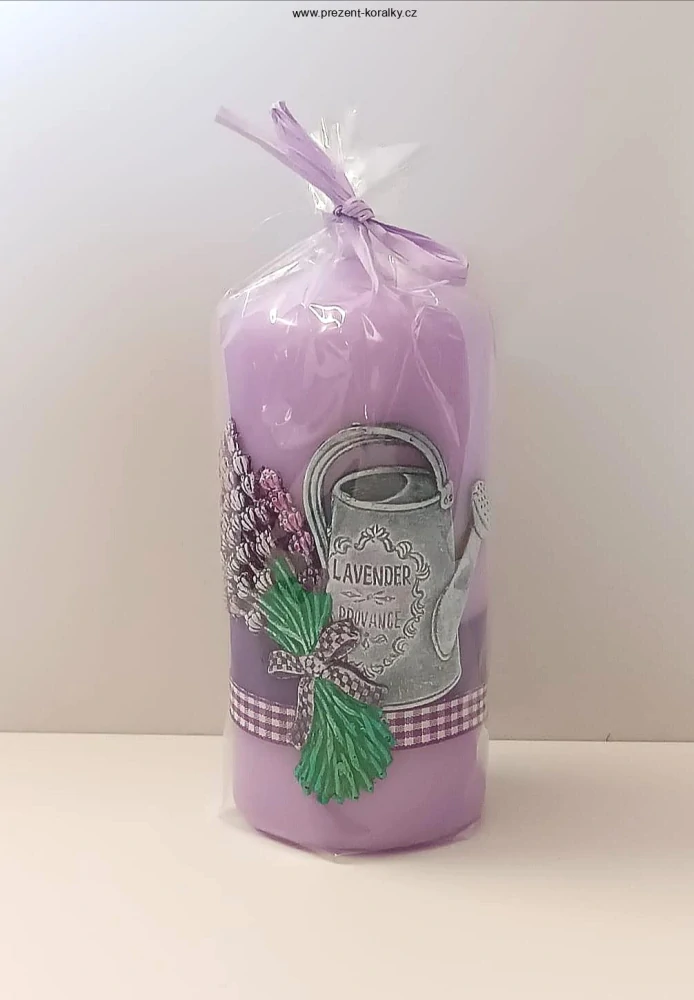 Fialová svíčka s motivem levandule je vysoká 12,5 cm a široká 6 cm. Levandulová svíčka váží 300 g. Vonná svíčka s levandulovým zátiším potěší každou milovnici levandule.
