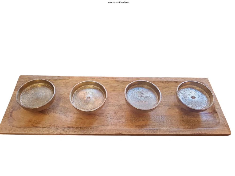Adventní svícen z mangového dřeva o velikosti 45,9 cm x 14,8 cm x 1cm, je vhodnou dekorací do Vašeho domu nebo bytu v adventním období. Dřevěnému svícnu dodávají moderná vzhled pozlacené, bytelné stojánky na svíčky.