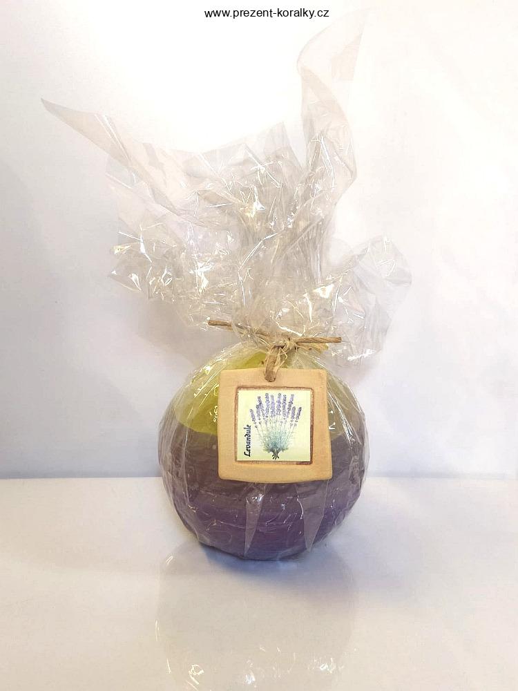 Tato parafínová svíčka s vůní levandule má průměr 10 cm. Svíčka je ve tvaru koule a je dárkově balena do celofánu. Tato levandulová svíčka je laděna do žluté a fialové barvy. Svíčku zdobí keramická destička s obrázkem levandule, která je přivázaná na celofánu.