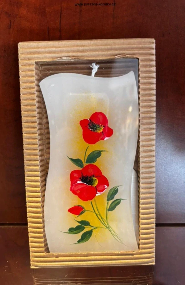 Plochá parafínová svíčka v bílé a červené barvě. Svíčku zdobí ručně malovaný vlčí mák. Součástí balení je kovový stojánek. Výška 14 cm, šířka 6 cm. Svíčka je vhodná jako dárek pro každého milovníka svíček.
