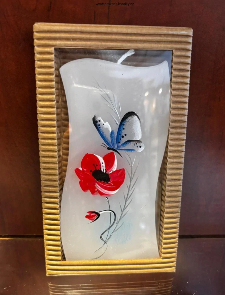 Plochá parafínová svíčka v bílé a červené barvě. Svíčku zdobí ručně malovaný vlčí mák. Součástí balení je kovový stojánek. Výška 14 cm, šířka 6 cm. Svíčka je vhodná jako dárek pro každého milovníka svíček.