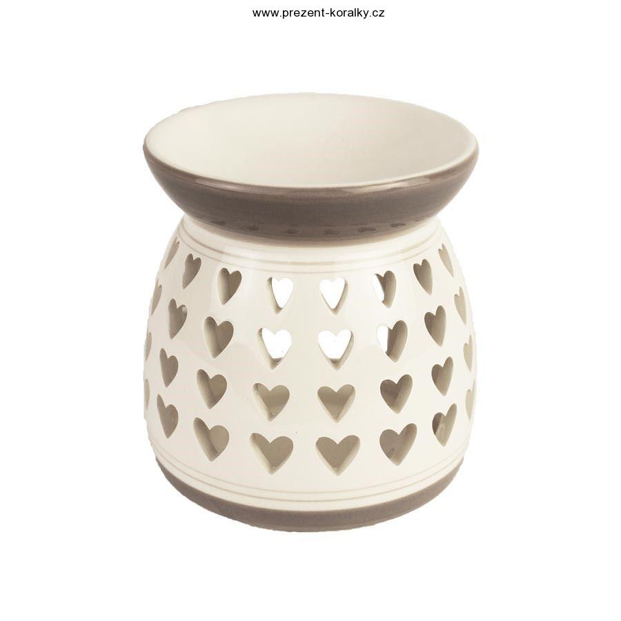 Bílo - šedá porcelánová aromalampa s výřezy ve tvaru srdíček. Aromalampička je vhodná pro vonné vosky i vonné olejíčky, mistička na vonné esence je dostatečně hluboká. Tato krásná, bílá a moderní světá aromalampička zaručeně krásně ozdobí a provoní Váš byt či dům. Rozměry aromalampy jsou: průměr 10,8 cm, výška 11,4 cm.