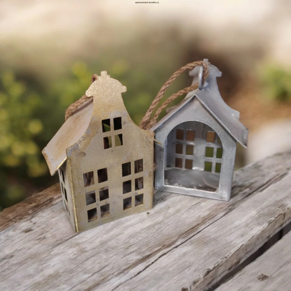 Domeček je vyrobený z plechu a je laděn do stříbrné a zlaté barvy. Domeček má rozměry 12 cm x 7 cm x 4 cm. Domeček je na jednu čajovou svíčku a hodí se jako skvělý doplňek na skříňku či konferenční stolek. Do poznámky prosím napiště jakou barvu chcete.