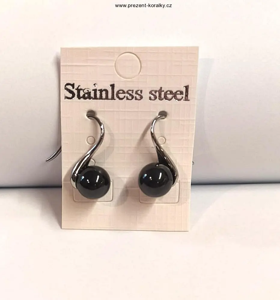 Krásné visací náušnice jsou vyrobeny z chirurgické oceli. Náušnice zdobí černá perla o průměru 0,8 cm, celková délka náušnic je 1,7 cm. Tyto krásné náušnice s perlou potěší každou ženu či dívku. Náušnice s černou perlu jsou určené na každodenní nošení.