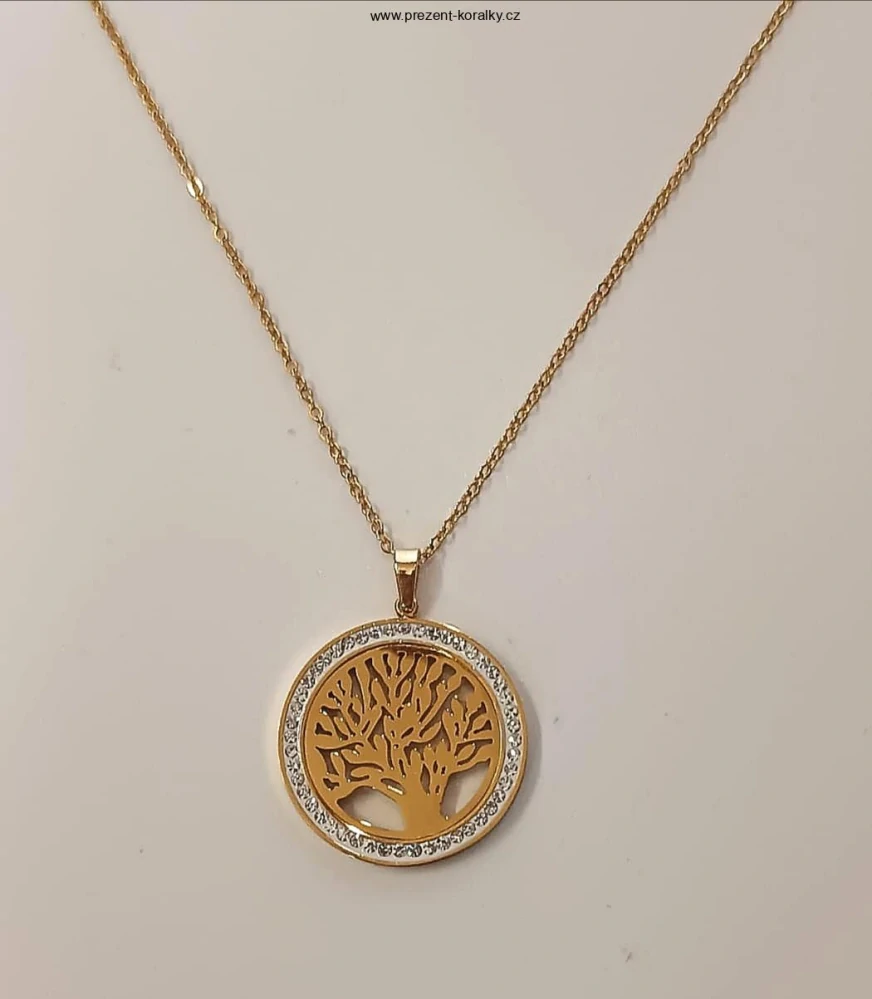 Elegantní řetízek zlaté barvy je vyrobený z chirurgické oceli a zdobí ho přívěsek s motivem strom života. Průměr přívěsku se stromem života je 2,5 cm a je zdobený SW krystalky čiré barvy. Délka zlatého řetízku je 48,5 cm. Tento zářivý ocelový řetízek potěší každou ženu či dívku.