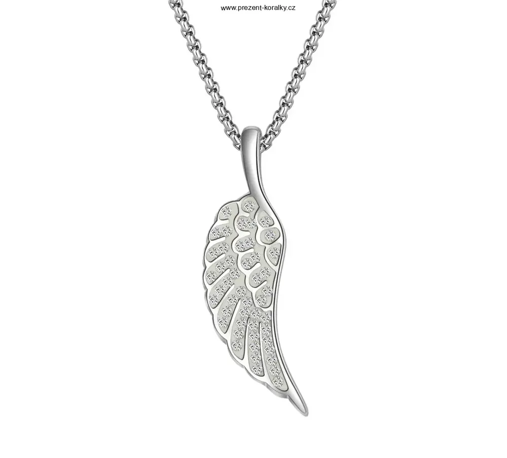 Krásný náhrdelník ve tvaru křídla je zdoben Swarovski krystaly čiré barvy. Přívěšek je z chirurgické oceli, délka přívěsku 3,6 cm, délka ocelového řetízku je 48 cm a zapíání má řešené na karabinku.