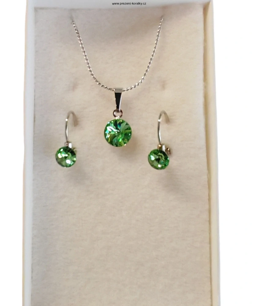 Zářivá sada je vyrobena z kvalitní bižuterie bez obsahu niklu a je rhodiovaná. Sada se skládá z řetízku a náušnic se zeleným SW krystalem. Řetízek je dlouhý 40 cm, prodlužovací řetízek je dlouhý 6 cm. Průměr přívěsku se zeleným SW kamínkem je 0,8 cm. Náušnice mají zapínání řešené na zacvaknutí u a také jsou zdobeny zeleným SW krystalem o průměru 0,5 cm. Tato krásná sada šperků potěší každou ženu či dívku jako dárek.