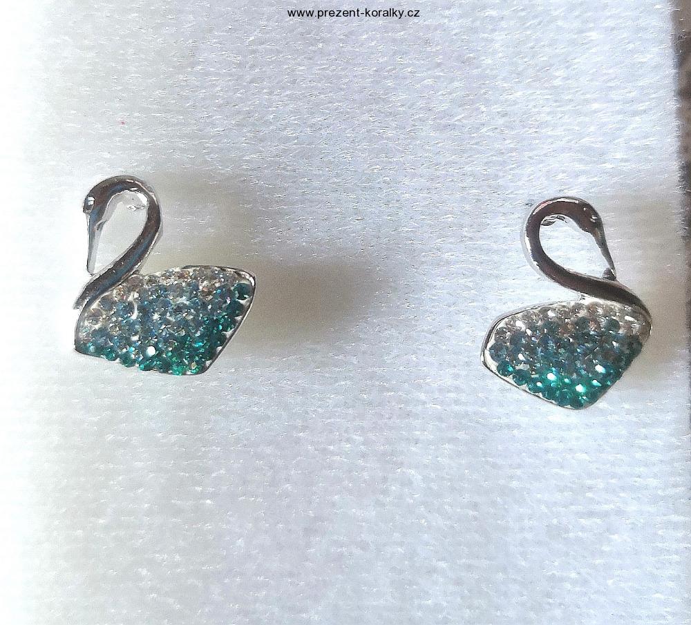 Zářivé modré náušnie jsou vyrobeny z bižuterie bez obsahu niklu a jsou rhodiované. Náušničky ve tvaru labutí jsou zdobeny SWAROVSKI kamínky čiré a modro-zelené barvy. Rozměr labutích náušnic je 1,3 cm x 1,5 cm a zapínání mají řešené na puzetku. Tyto krásné náušnice s labutěmi zaručeně potěší každou ženu či dívku.