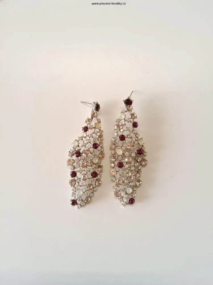 Záživé štrasové náušnice jsou vyrbeny z vysoce kvalitní bižuterie a jsou visací. Náušnice jsou dlouhé 8,5 cm, široké jsou 3 cm. Štrasové náušnice jsou zdobeny zářivými kamínky čiré a fialové barvy. Náušnice mají zapínání řešené na puzetku. Tyto krásné náušnice zaručeně potěší každou ženu.