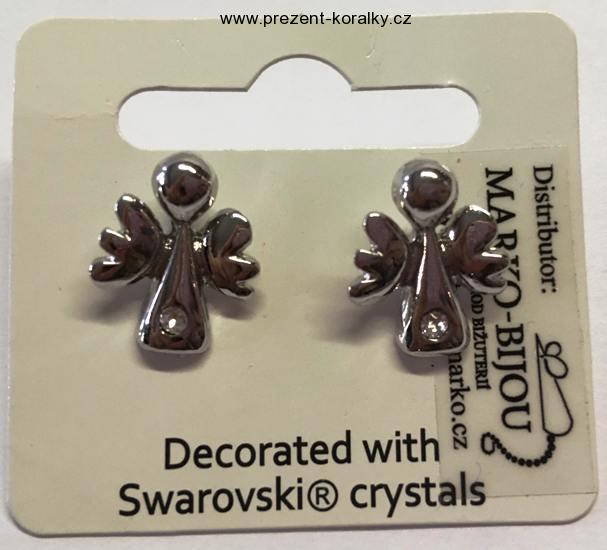 Kvalitní náušnice z bižuterie bez obsahu niklu. Náušnice jsou stříbrné barvy a jsou ve tvaru andílka, který je vysoký 1,7 cm a je zdobený čirým SW krystalem. Zapínání je řešeno na puzetku.