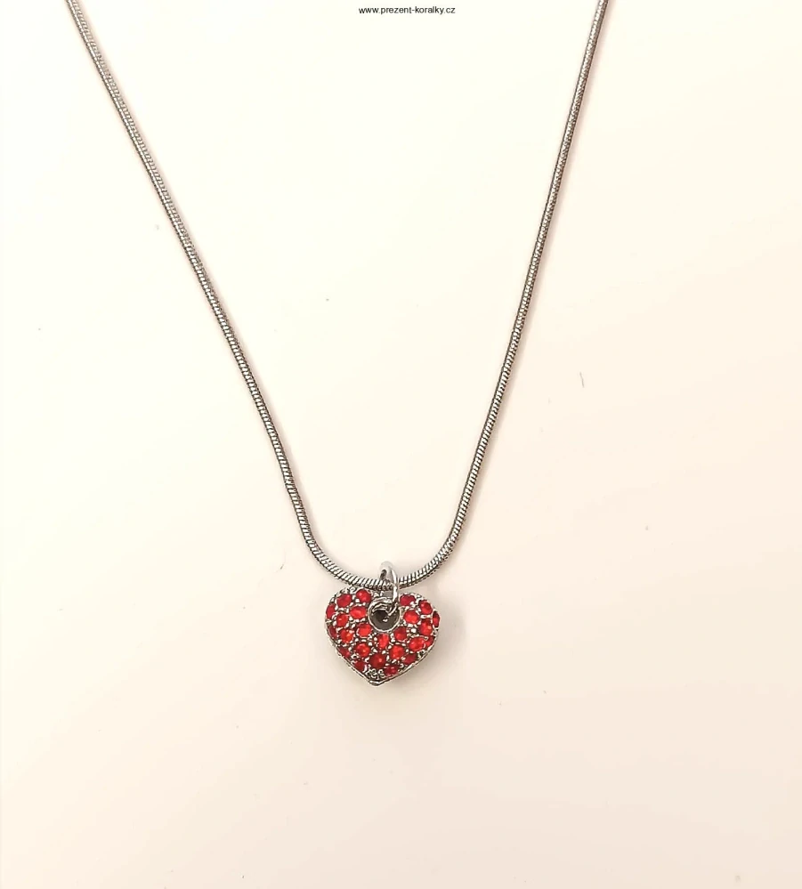 Elegantní náhrdelník s přívěškem ve tvaru srdce je vyroben s bižuterie bez obsahu niklu a je rhodiován. Přívěšek je posetý jemnými SW krystaly červené barvy. Rozměr přívěsku se srdcem je 1,2 cm x 1,2 cm, řetízek je dlouhý 40 cm. Tento zářivý náhrdelník s červeným srdcem ozdobí každou ženu či dívku.