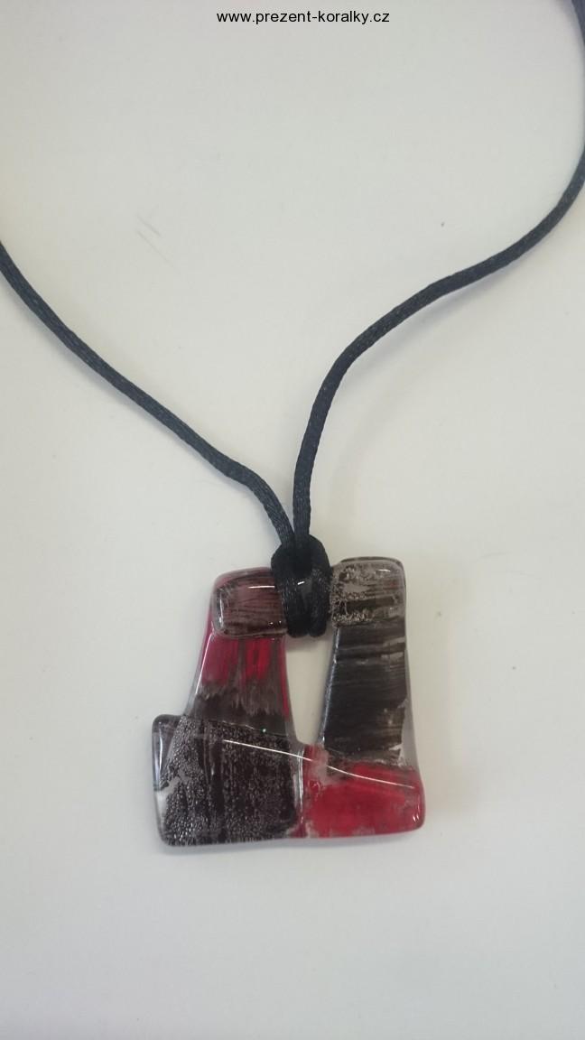 Skleněný přívěsek na šnůrce v barvách růžové , šedé a černé. Šířka přívěsku je 4 cm a délka je 4 cm. Celková délka přívěsku i se šňůrkou je 28 cm.