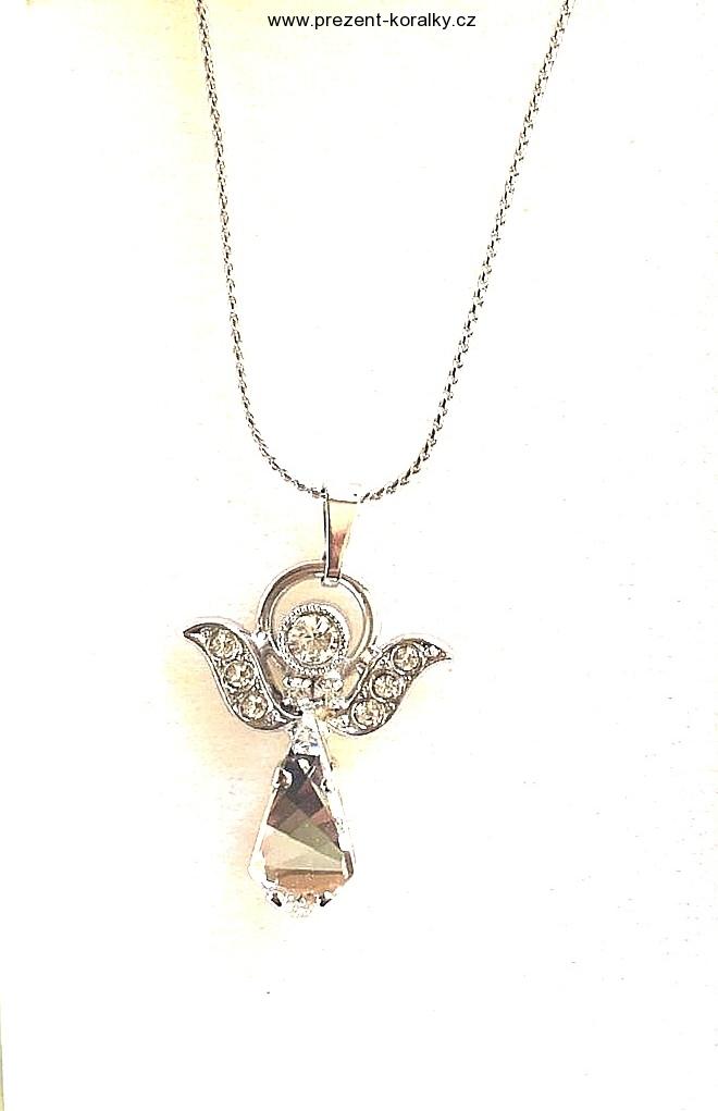 Moderní, zářivý řetízek je vyrobený z bižuterie bez obsahu niklu a je rhodiován. Délka řetízku je 40 cm + 5 cm prodlužovací řetízek a zapínání má řešeno na karabinku. Přívěsek ve tvaru anděla má rozměry 3 cm x 2 cm a je zdoben SWAROVSKI kamínky čiré barvy. Tento krásný řetízek zaručeně potěší každou ženu či dívku.