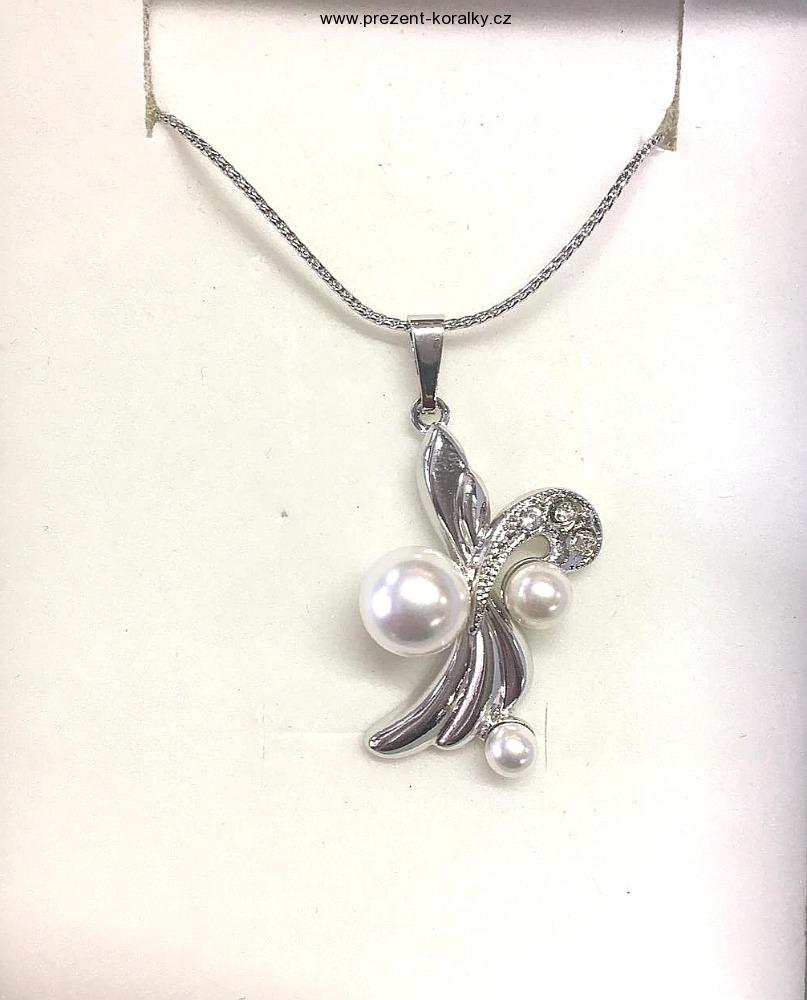 Krásný náhrdelník je vyrobený z bižuterie bez obsahu niklu a je rhodiovaný. Přívěsek je zdoben SWAROVSKI kamínky čiré barvy a perličkami. Celkový rozměr přívěsu je 4 cm x 2 cm. Délka řetízku je 40 cm +7 cm prodlužovací řetízek a zapínání má řešené na karabinku. Tento krásný řetízek zaručeně vkusně ozdobí každou ženu či dívku.