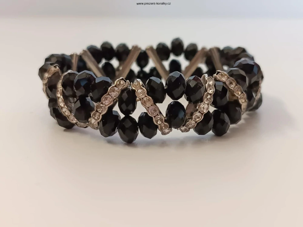 Náramek je složený z korálku černé barvy a je zdoben kamínky čiré barvy. Šířka náramku je 2 cm a jeho průměr je 6 cm. Tento krásný korálkový náramek s kamínky ozdobí každou ženu či dívku.
