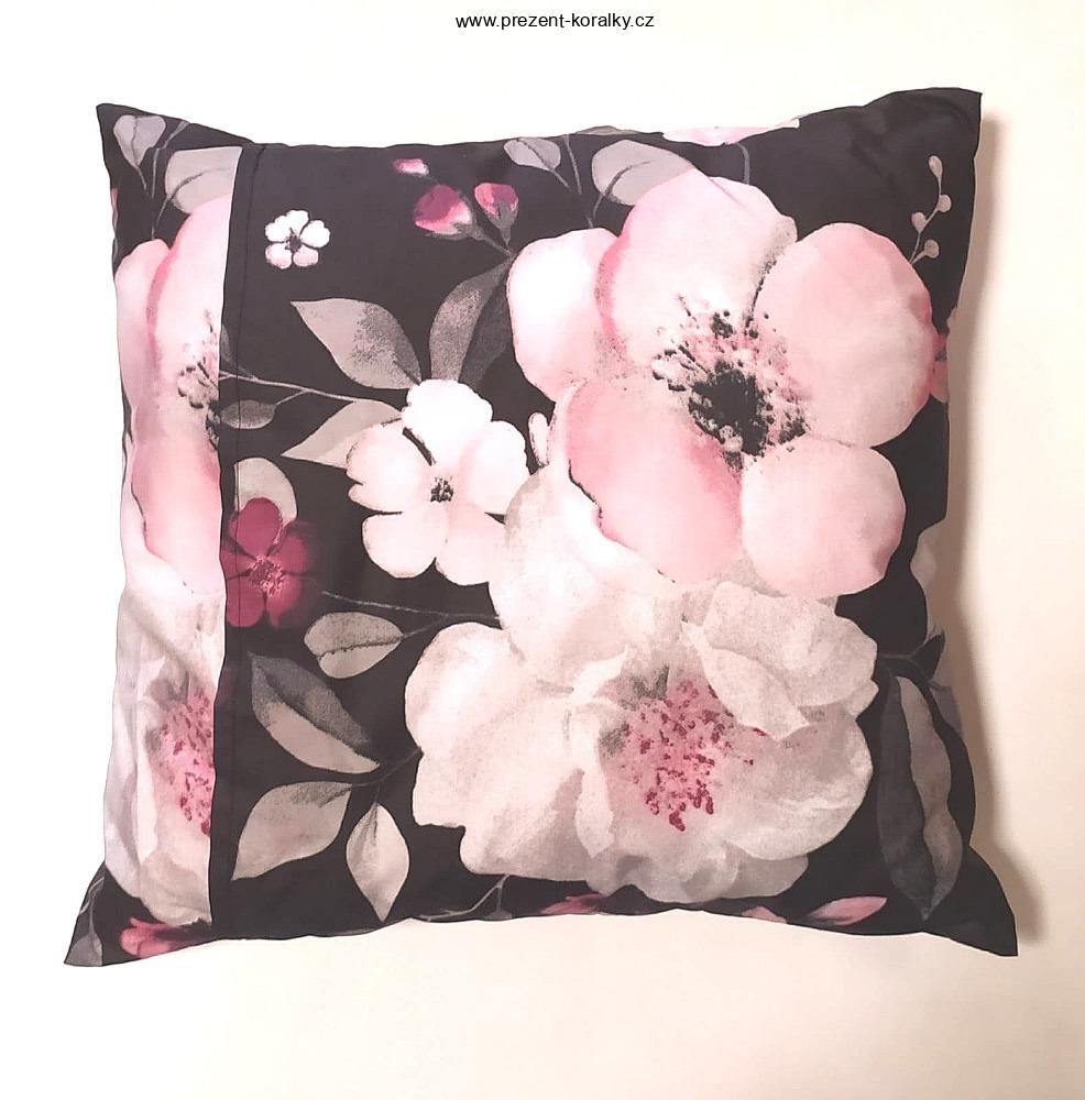 Dekorační polštářek černé barvy je zdobený motivem růžových kvítků. Polštářek je veliký 36,5 cm x 38 cm. Tento krásný polštářek se hodí jako dekorace do každé domácnosti.