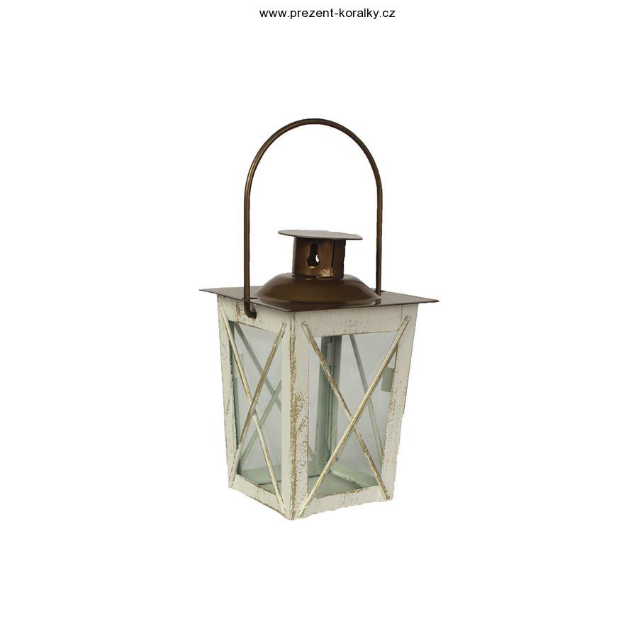Tato krásná kovová lucerna je laděna do bílé a zlaté barvy. Svíčka se do lucerny dává tak, že odejmete stříšku lucerny a hořejškem ji do ní vložíte. Dno lucerny má rozměry 7,5 cm x 7,5 cm a celková výška lucerny je 11,7 cm.