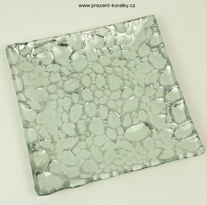 Dekorační skleněný tácek má rozměry 19,5 x 19,5 cm.