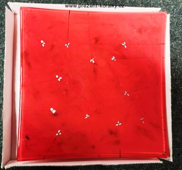 Moderní červený skleněný tác se stříbrnými kvítky. Rozměry 24,5 x 24,5 cm. Tento krásný moderní tác je vhodný do každé domacnosti a do každé kuchyně.