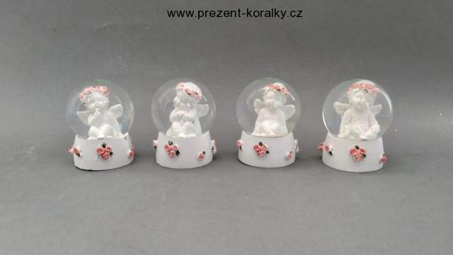 Krásné skleněné sněžítko s andělem. Uvnitř sněžítka je roztomilý andílek s růžovým věnečkem na hlavě. Po protřepání sněží na andílka bílý sníh. Výška sněhové koule 6 cm.
