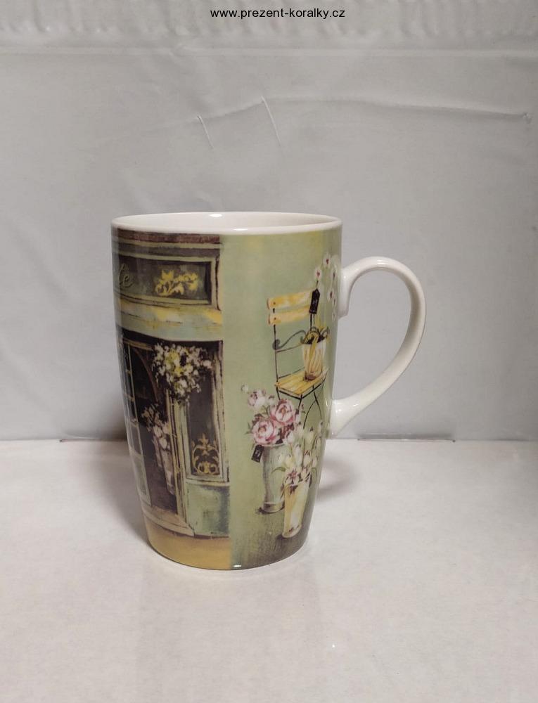 Tento hrnek je vyrobený z kvalitního porcelánu. Hrnek je zdobený motivem pařížské kavárny. Tento porcelánový hrnek je laděn do zelených barev. Hrnek má objem 450 ml, je vysoký 12,5 a má průměr 8 cm. Tento hrnek je vhodný do myčky i do mikrovlnné trouby.