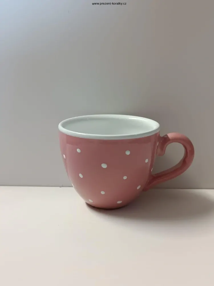 Ručně vyrobený roztomilý keramický hrnek růžové barvy s bílými puntíky - ČESKÁ VÝROBA. Výška 7,5 cm, průměr 9 cm. Hrnek je vhodný na teplé i studené nápoje. Hrneček z keramiky je vhodný do myčky i do mikrovlnné trouby. Vychutnejte si Váš oblíbený nápoj z tohoto krásného hrnku ČESKÉ VÝROBY!