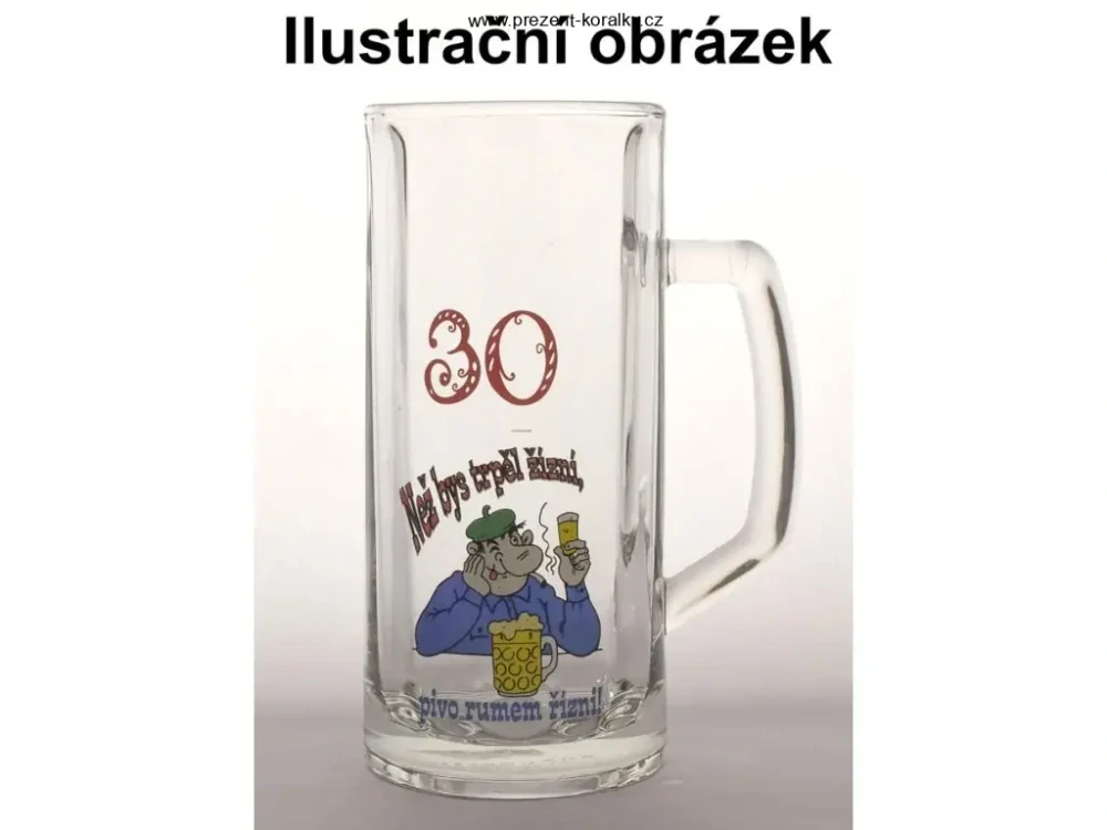 Vtipný půllitr je vyrobený z ČESKÉHO SKLA. Půllitr je zdobený vtipným obrázkem s čísle 30 a nápisem "Než bys trpěl žízní, pivo rumem řízni!". Objem půllitru je 500 ml, vysoký je 15,2 cm a jeho průměr je 8,9 cm. Tento vtipný půllitr je vhodným dárkem pro každého milovníka piva.